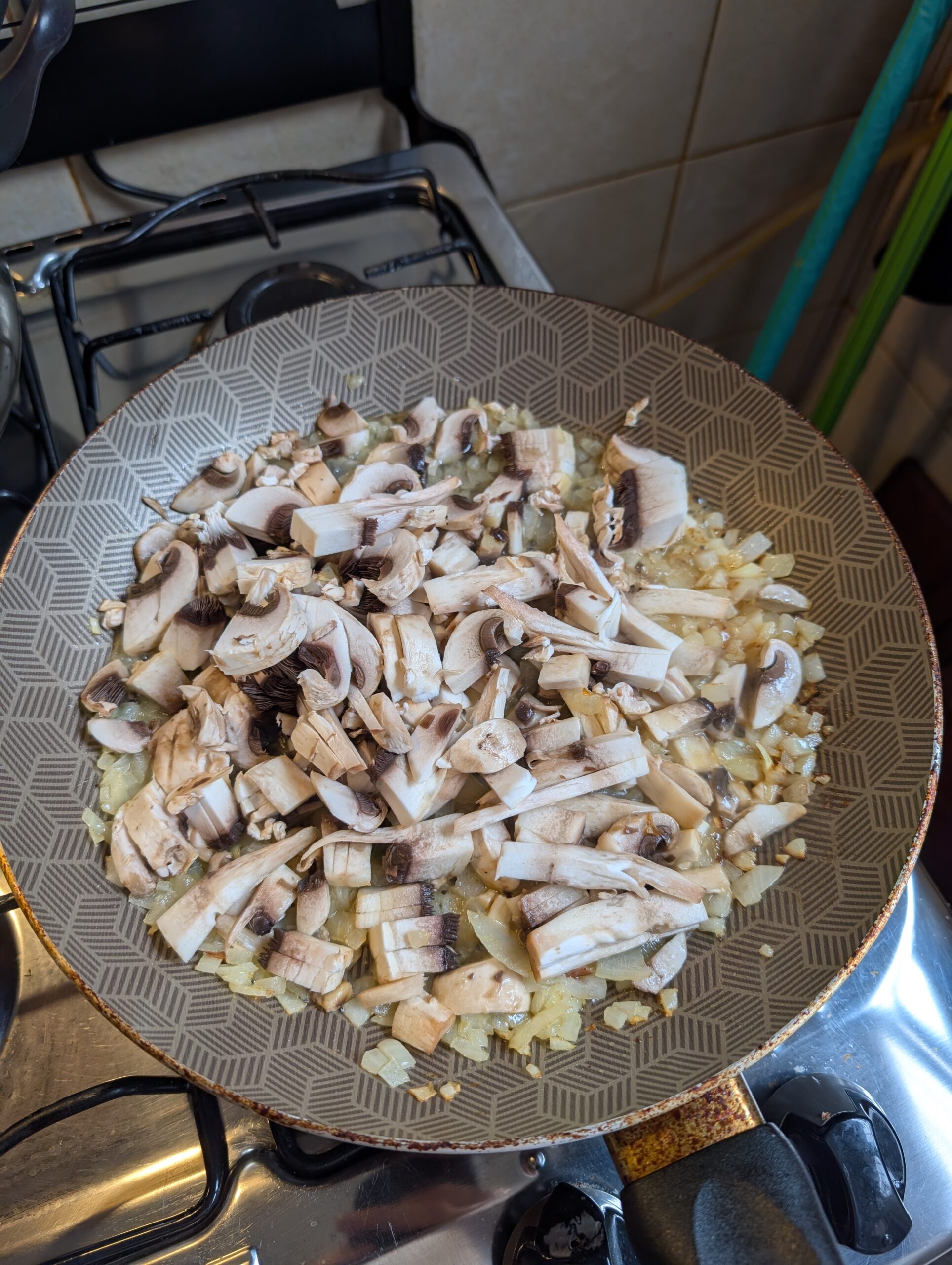 3. Agregar los champiñones y cocinar hasta que larguen su agua y se reduzca.