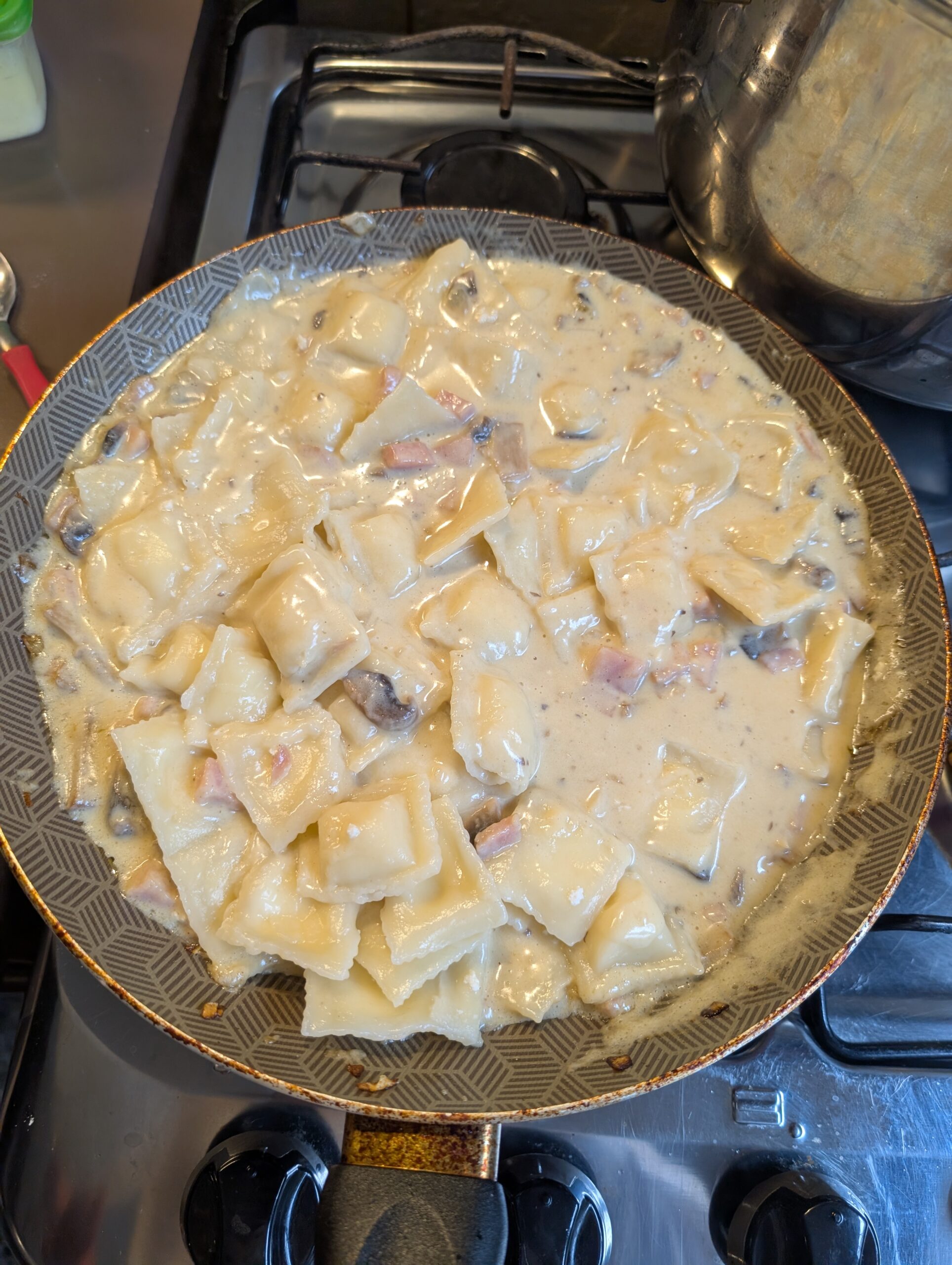 9. Agregar la pasta cocida directamente al sartén y mezclar bien para que se impregne con la salsa.